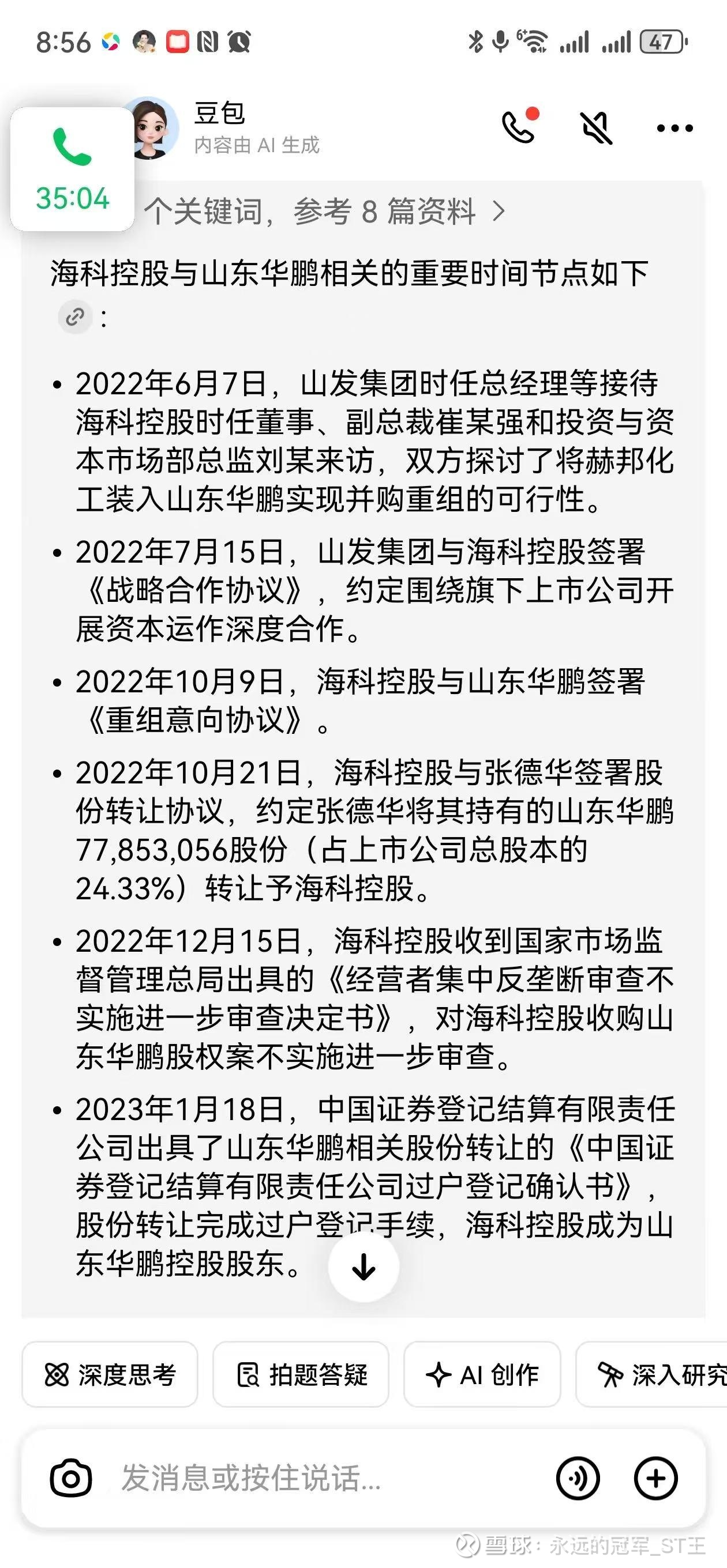 结论:海科集团控股2022年10月控股st华鹏,距今已经界满36个月(3年),作为中国民营企业500强的海科集团,年营业额740亿,年利税48亿,海科旗下的赫邦化工属于新材料领域,其产品广泛用于航空航天、半导体、航天飞机、航空发动机,精密医疗器械,机器人等所有高科技领域,其在2022年重组遇阻后,距今已满三年,随时开启重大资产重组、开启资产注入,另外,上市公司发起的与第二股东(实控人山东省国资委)距今已满10个月,随时终结,如能重组成功,st华鹏将变身新材料领域的高科技企业,其股价也许存在较大上升空间!