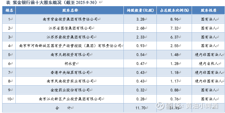 紫金银行是 2011 年 3 月由南京市辖区内原 4 家农村中小金融机构组建而成的股份制农村商业银行,初始注册资本为 20.00亿元。2018 年 12 月,紫金银行公开发行人民币普通股(A 股)股票 3.66 亿股,募集资金 11.46 亿元,于 2019 年 1 月 3 日在上海证券交易所上市,成为全国首家A股上市省会城市农商行,全国第6家A股上市农商行,江苏省第8家A股上市银行。截至 2025年9月末,紫金银行注册资本和实收资本均为 36.61亿元,无控股股东及实际控制人,前十大股东合计持股31.95%,其中最大的单一股东为南京紫金投资集团有限责任公司(实控人为南京市国资委),持股比例为8.96%,此外,江苏省国信集团有限公司(7.32%)、江苏苏豪投资集团有限公司(6.37%)、南京市河西新城区国有资产经营控股(集团)有限责任公司(2.55%)均为实力较强的国有法人,国有法人合计持股26.84%。总体而言,紫金银行股权结构较为分散。