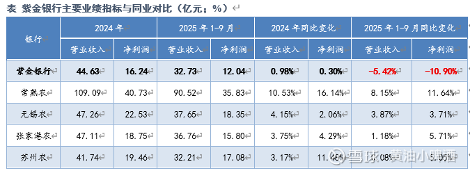 本文选取与紫金银行总资产规模相近的四家江苏省内农商行,包括江苏常熟农村商业银行股份有限公司(以下简称“常熟农”)、无锡农村商业银行股份有限公司(以下简称“无锡农”)、江苏张家港农村商业银行股份有限公司(以下简称“张家港农”)和江苏苏州农村商业银行股份有限公司(以下简称“苏州农”)。主要业绩指标进行对比,2024年紫金银行营业收入为44.63亿元,增幅0.98%,规模虽在苏州农之上,位列第三,但增幅垫底,其余四家增幅均在3%-10%之间;净利润为16.24亿元,增幅0.30%,规模及增幅均垫底。2025年1-9月,紫金银行实现营业收入32.73亿元,同比下降5.42%,净利润12.04亿元,同比下降10.90%,均由正转负,业绩进一步恶化;而其余四家同业银行营业收入和净利润均呈现正增长,其中常熟农净利润自2024年以来呈现两位数增长。另外,紫金银行的盈利指标全面落后,在42家A股上市银行中,紫金银行前三季度净利润规模排名倒数第一。