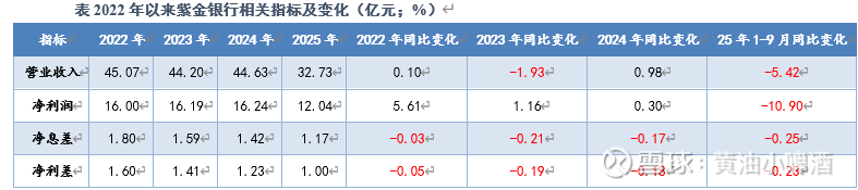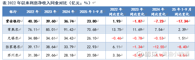 从收入结构来看,紫金银行最核心的来源利息净收入逐年减少,2022年-2024年及2025年1-9月利息净收入分别为40.35亿元、39.60亿元、36.74亿元和23.80亿元,增速持续为负且持续扩大。而对比银行方面,2022-2024年,仅常熟农利息净收入持续增长,增速持续放缓,另外三家银行利息净收入规模均有所减少。