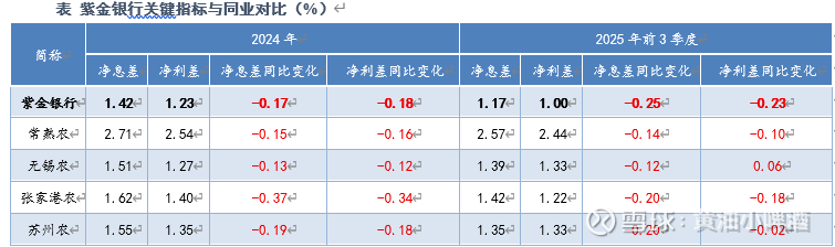 与同业对比来看, 2024年紫金银行净息差为1.42%,低于其余四家银行,降幅达0.17个百分点,降幅仅次于张家港农行和苏州农行;2025年9月末净息差下降0.25个百分点至1.17%,仍垫底且降幅最大,显著低于行业平均水平(1.42%)。2024年末净利差为1.23%,同业银行中垫底,2025年9月末进一步下降至1.00%。
