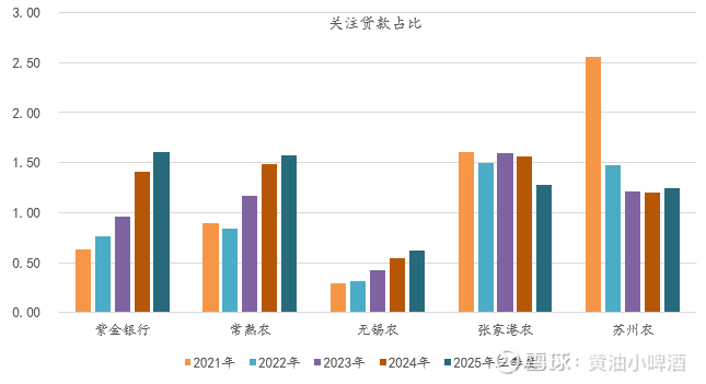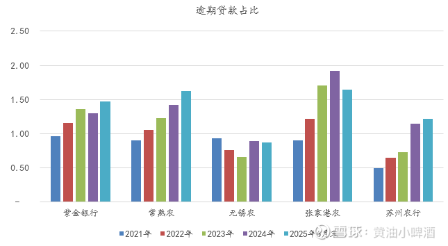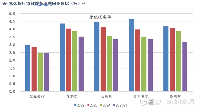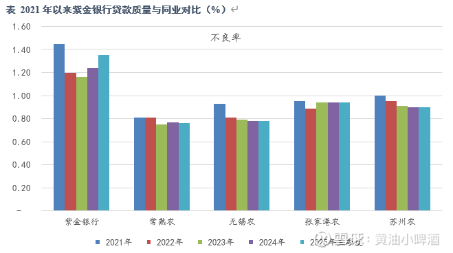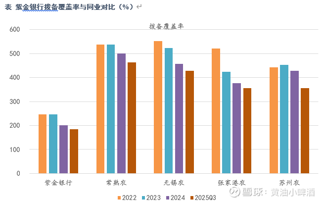 因此,我们看到的上市银行中最弱盈利表现,也已经是放宽拨备冲击后的结果。实际情况可能更弱,尤其是对比其不良率的表现。“维护”了利润,负面的影响体现在拨备覆盖率上,可以看到,5家银行中,紫金银行的拨备覆盖率最低,2025年9月末甚至不及常熟农、无锡农和张家港农的一半。