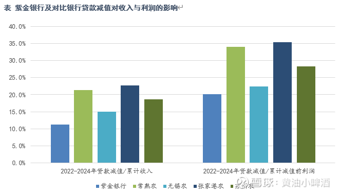 金融投资的部分收益也是以利息收入而非投资收益体现的,所以很难将利息收入中贷款和金融投资拆分,我们就只观察风险端的影响,即金融投资减值的影响。从2022-2024年的减值计提及余额与金融投资的对比来看,紫金银行金融投资计提的减值准备占比是最高的,对收入与利润的影响也是最大的。这和投资资产结构所反映的直观感觉是相悖的。因此,尽管紫金银行的金融投资占比最低,但其对盈利的相对冲击却是最大的。