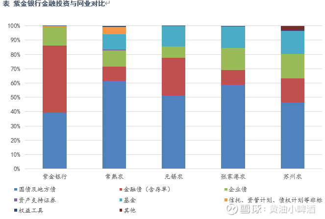 接下来看金融投资。上文我们知道,紫金银行在5家银行中金融投资占比最低,没有完全享受到近几年债券市场的收益。从金融投资的结构来看,紫金银行的风险偏好相对最低,国债与地方债和风险较低的金融债(含存单)合计占比约86%,而基金、信托、资管计划、债权计划等非标以及权益投资占比不足1%。相应的结果可能是,收益率较低同时风险(减值)较低。