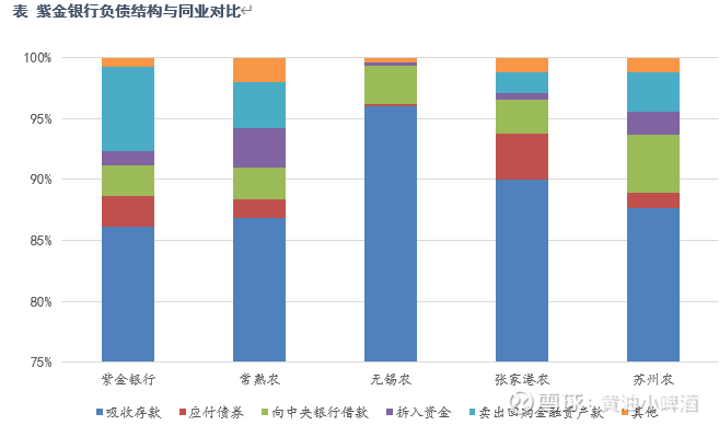 对比资产结构:(1)紫金银行发放贷款及垫款占比最高,但整体差距不大,与最低的无锡农差距6.76个百分点;(2)紫金银行金融投资占比最低,唯一一个不足20.00%的主体,与次低的张家港农差6.89个百分点,与最高的无锡农差10.17个百分点。(3)紫金银行买入返售金融资产占比最高,达到5.17%,其他均在1.6%以下。(4)紫金银行拆出资金占比较高(2.47%),最高的苏州农占比3.02%,其他均在1.2%以下。