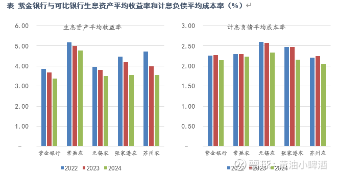 从最终结果来看,紫金银行收益的压力主要体现在资产收益端,2022-2024年紫金银行生息资产平均收益率均是5家银行最低的,其中2024年较最高的常熟农低1.4个百分点。计息负债成本端,紫金银行在对比银行中处于中间水平。