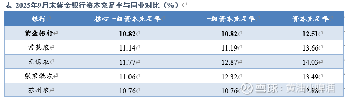 在本文的最后,我们再分析下资本充足情况,盈利压力影响资本积累,进而影响未来业务扩张,从而再次对资本积累构成压力。2022-2024年末,紫金银行核心一级资本充足率分别为10.42%、10.28% 和10.78%,有所增长;一级资本充足率分别为10.42%、10.28% 和10.78%,同样保持增长;资本充足率分别为14.35%、14.03%和13.00%,却出现逐年下滑。2025年9月末紫金银行核心一级资本充足率、一级资本充足率及资本充足率分别为10.82%、10.82%和12.51%,其中资本充足率在5家银行中处于最低水平,核心一级资本充足率和一级资本充足率处于次低水平,仅高于苏州农。根据金融监管总局披露的数据,2025年9月末我国商业银行资本充足率15.36%,一级资本充足率12.36%,核心一级资本充足率10.87%;农商行的资本充足率为13.20%,紫金银行均低于上述水平。