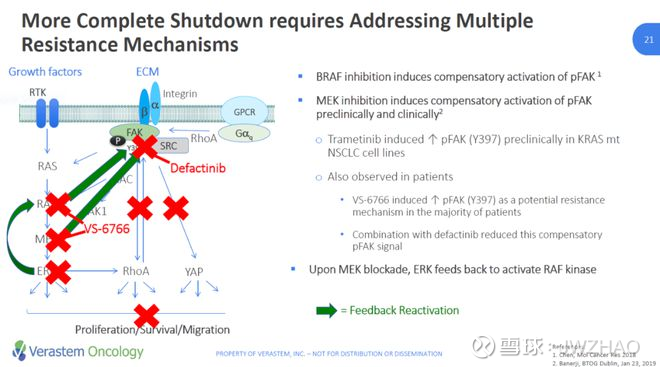 作用机制上,VS-6766是一款能够同时抑制RAF和MEK活性的小分子抑制剂,在临床前试验中,能够抑制多种RAS和RAF突变体介导的信号。而defactinib能够特异性抑制FAK和相关蛋白激酶PYK2的活性。FAK抑制剂的机制和临床有效性在Verastem和应世生物等多个早期临床试验中得到了验证。