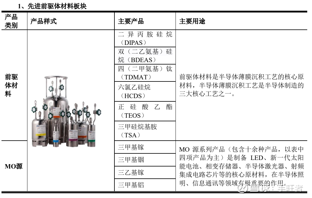 大家好,我是苏州工业园区的一家硬核科技企业,专攻半导体材料的卡脖子环节,主要搞三样核心电子材料的研发、生产和销售:先进前驱体(包含 MO 源)(营收28%,毛利率50%)、电子特气(营收61%,毛利率35%)和光刻胶等。过去从MO源龙头转型成功,现在卡位国产替代最前沿,聪明的你能猜到我是$南大光电(SZ300346)$ 吗?电子化学品行业市值中我暂以402亿排名第二,438亿的鼎龙股份,480亿的安集科技也就多几个涨停的shi。介绍下我家的三个产品: