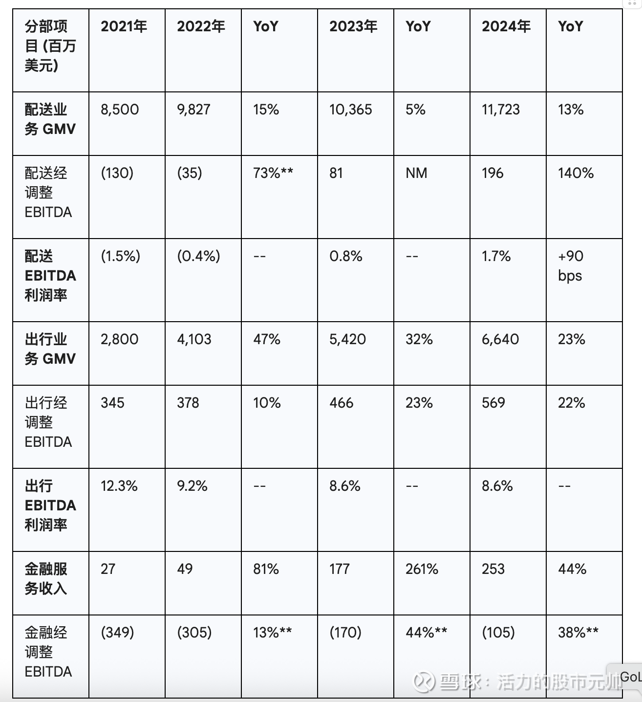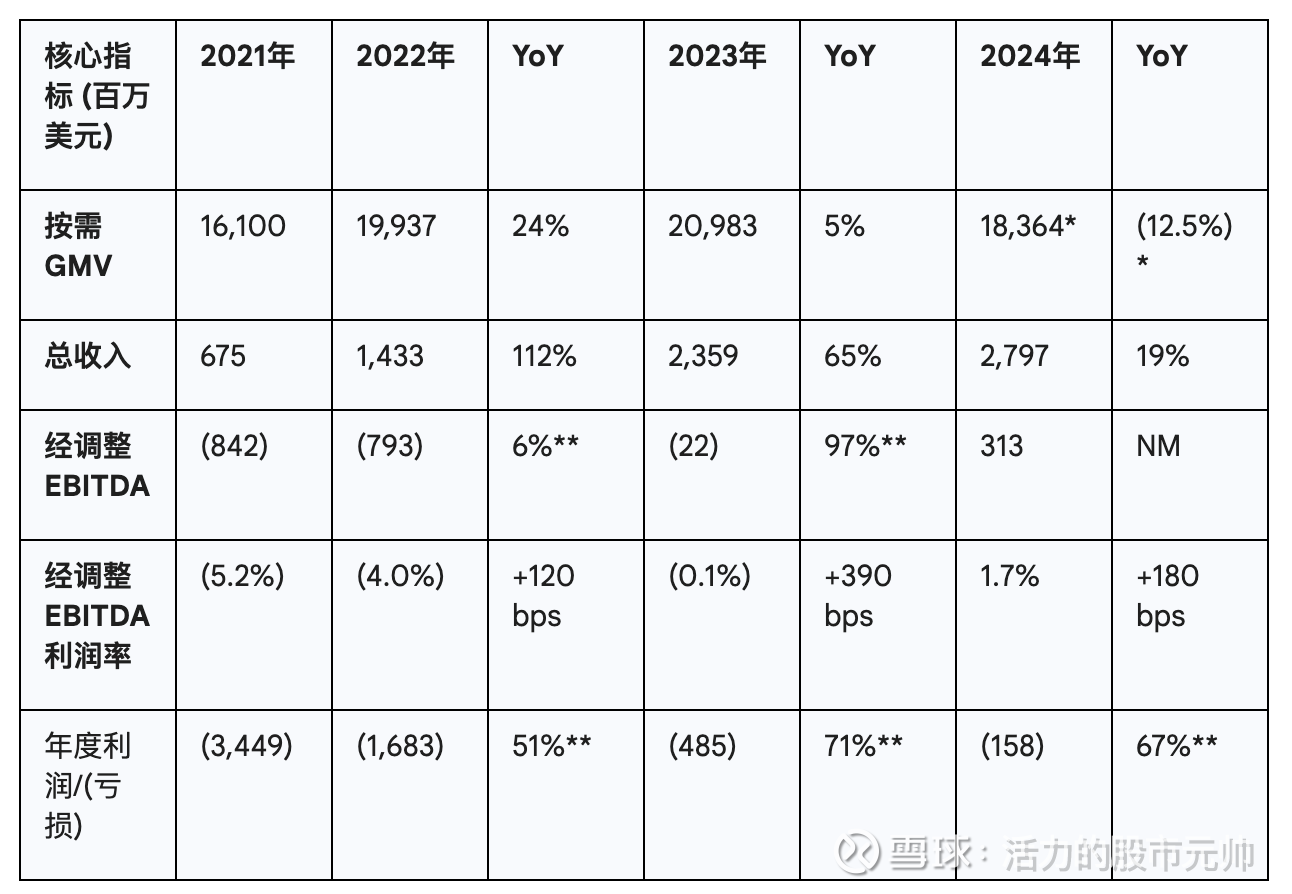 注:2024年统计口径调整为“按需 GMV”,剔除了金融 TPV 。加星号(**)表示亏损收窄。数据源自Grab 投资者关系网站,NM表示数据不可以(上一年度亏损而这一年度转正)。