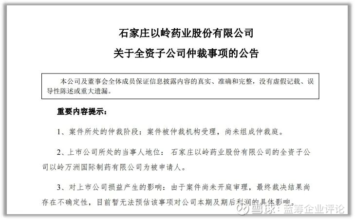 3月2日,以岭药业披露,其全资子公司以岭万洲国际制药有限公司被美国公司Gerbera Therapeutics提起仲裁。对方就委托加工协议主张履行瑕疵并索赔,香港国际仲裁中心已受理此案。