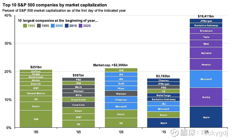 不同年份开始时标普500指数前10大市值股票没有股票连续40年在这个表单上在这个表单待了超过30年的有两个股票:GE和Exxon在这个表单待了超过20年并且还在上面的只有微软在这个表单待了超过20年并且被干掉的是:IBM目前的这个表单上,8家科技公司+2家金融企业(JP摩根和伯克希尔)