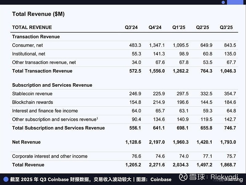 据 Coinbase 发布的 2025 年第三季度财报,其「利息及融资收入」高达 3.55 亿美元,其中绝大部分来自稳定币业务。据此推算,这项业务在 2025 年为 Coinbase 贡献了约 14 亿美元的收入,占其总收入的比重越来越高。在交易量萎靡的熊市,这笔稳定且可观的现金流就是 Coinbase 的救命稻草。