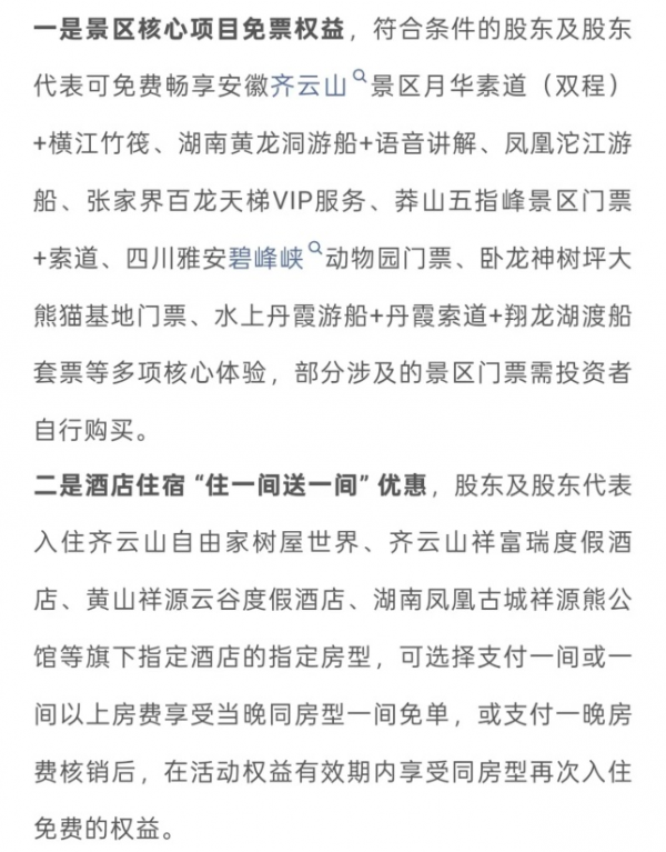 11月12日,祥源文旅(600576.SH)宣布:11月13日至12月31日,符合条件的股东及股东代表可免费享受旗下自有景区项目,如安徽齐云山等景区的指定项目(部分非上市公司体系内的景区门票需自行购买);旗下多家酒店推出指定房型住一间送一间优惠。