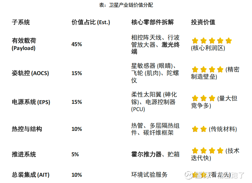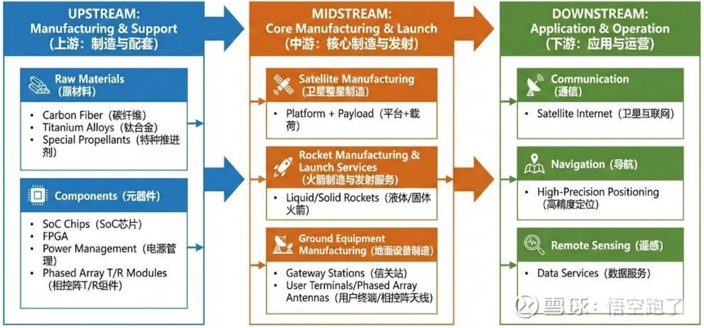 一、上游(制造与配套):元器件(SoC芯片、FPGA、电源管理、相控阵T/R组件等);原材料(碳纤维、钛合金、特种推进剂)