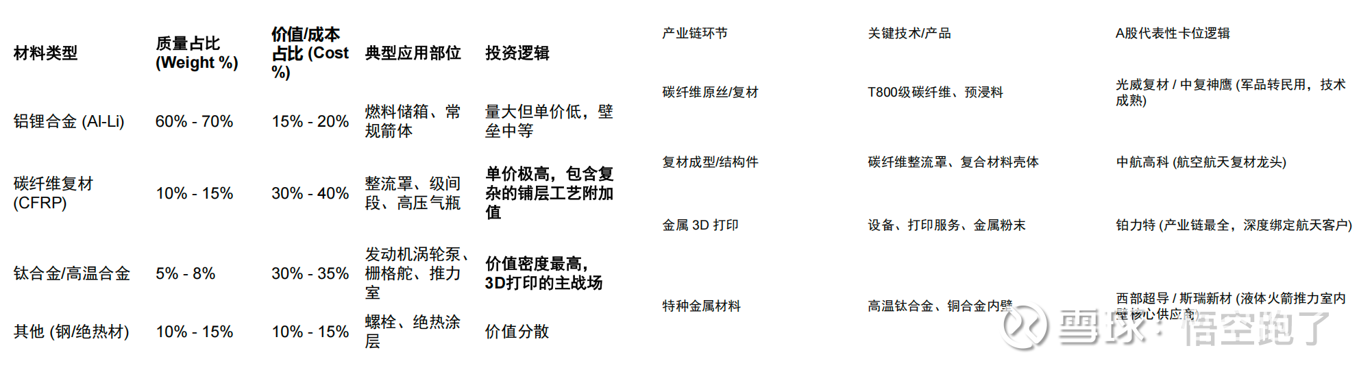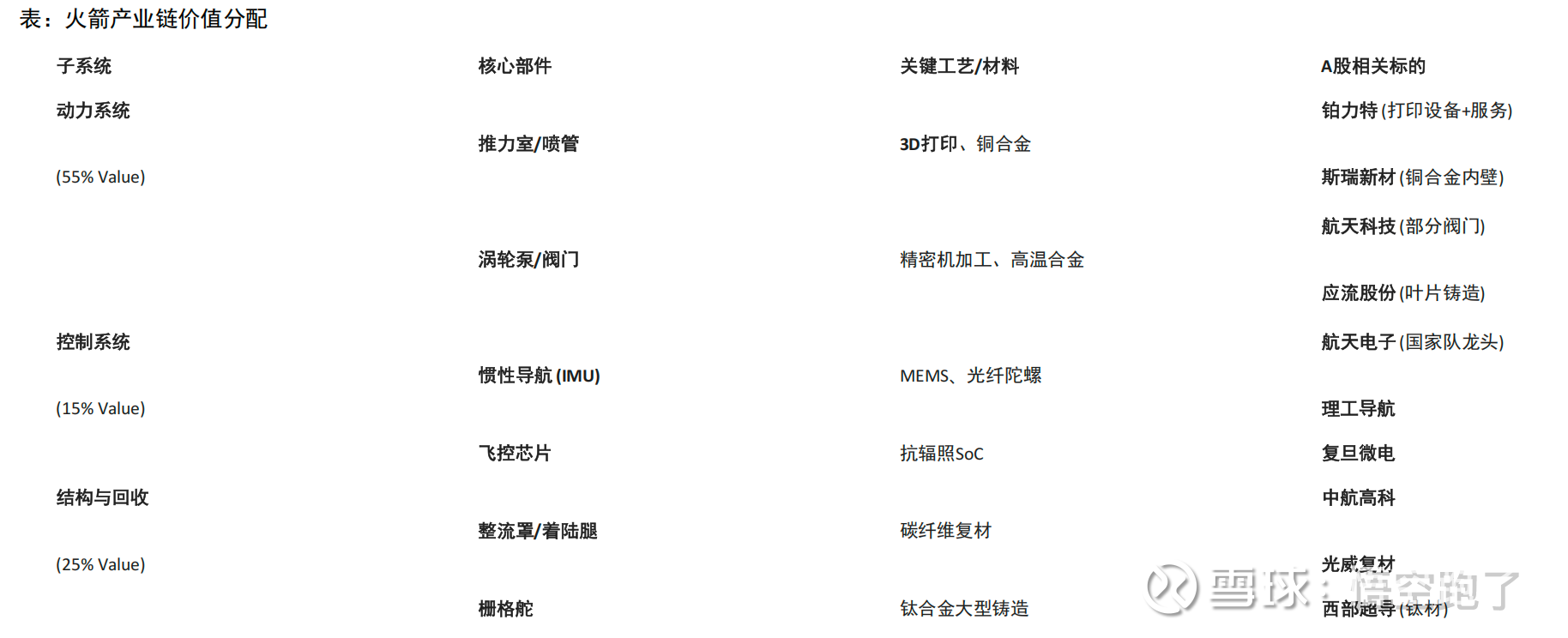 发动机系统 (Propulsion): 50% - 60% (价值最高,材料主要是高温合金)