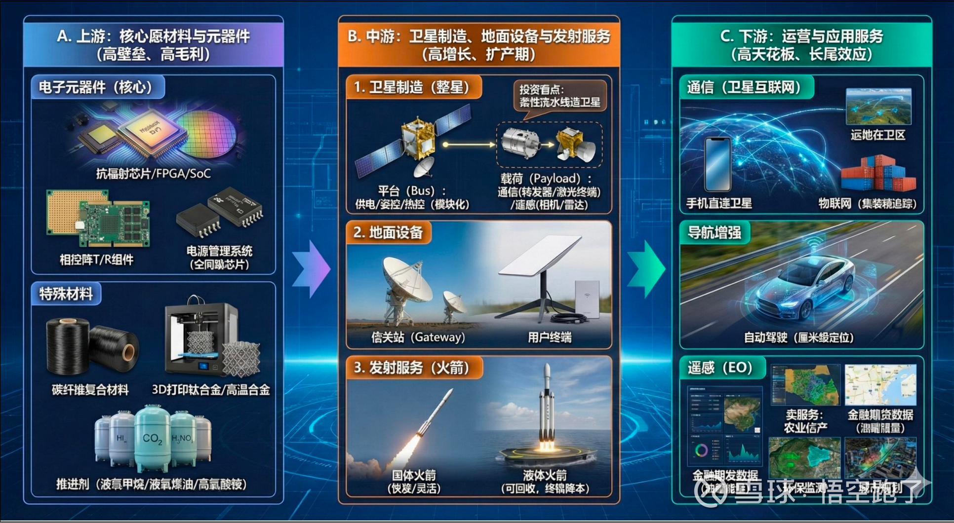 下游(应用与运营):通信(卫星互联网)、导航(高精度定位)、遥感(数据服务)等