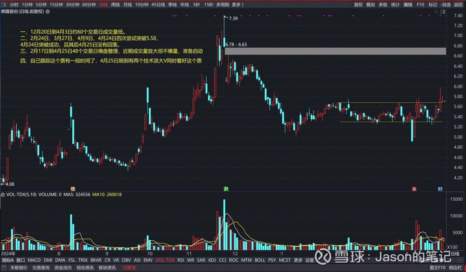 三、2月17日到4月25日48个交易日横盘整理,近期成交量放大但不爆量,准备启动。