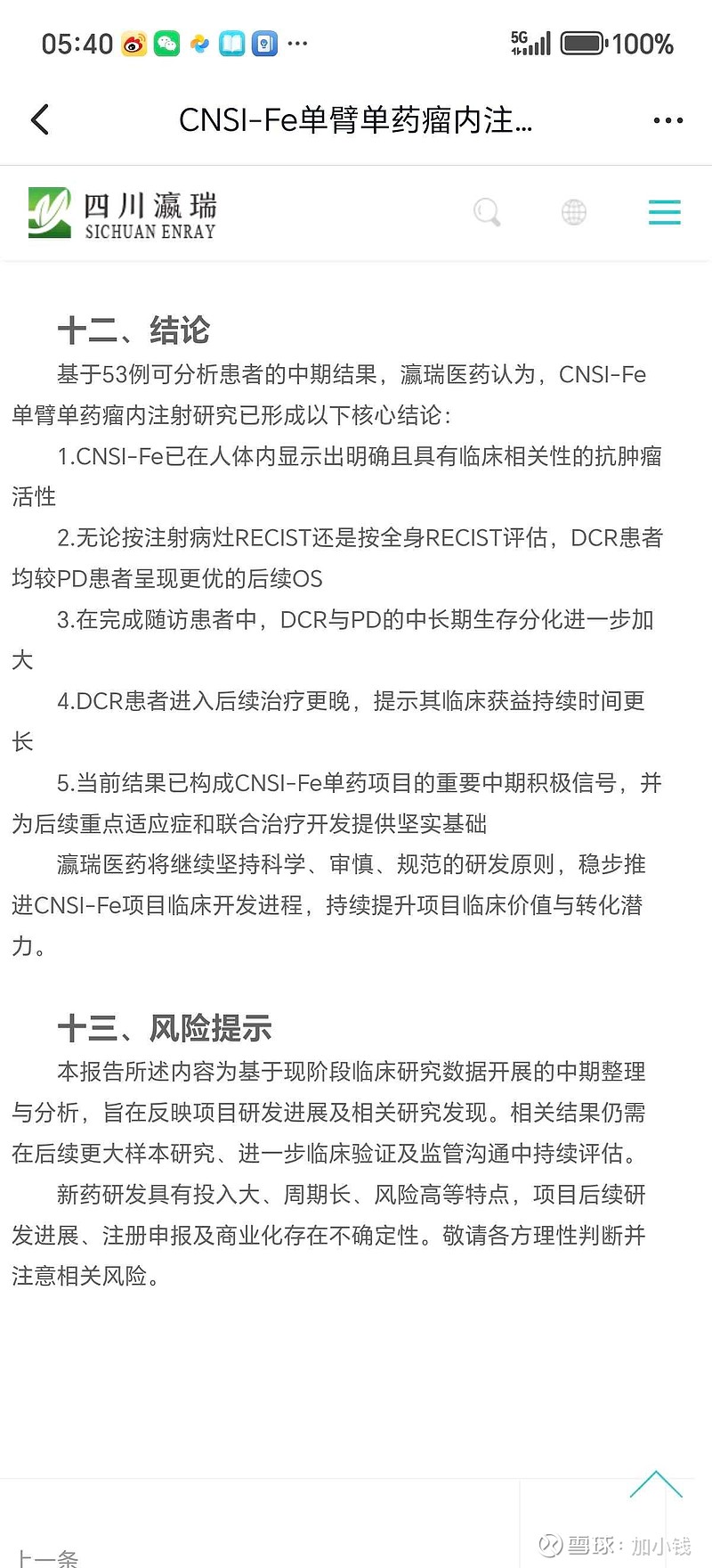 5有意思的临床现象。1,纳米碳铁治疗后,肿瘤中心发生坏死,但周围受到阻碍。这提示,纳米碳铁诱导肿瘤坏死发生于肿瘤缺氧区,这恰恰验证铁死亡癌症治疗的基础原理,即肿瘤通过其微环境的缺氧特性,逃避传统肿瘤药物的灭杀。而纳米碳铁恰恰对这一特性有效。即纳米碳铁治疗负责肿瘤中心灭杀,如加上放疗(特别有效于瘤体外圈)则有可能大幅提高DCR比例。2,全身DCR与注射灶DCR比例趋同,意味着纳米碳铁治疗具有全身(远端)效应,即纳米碳铁局部注射不仅是局部有效,同样具有全身效应。这意味着这类比于静脉与口服的全身效果,但解决了铁死亡药物研发的重要瓶颈(全身效应,但没有全身毒性)3,药物副作用,即便是低副作用(局部注射部位红肿,一过性发烧,呕吐),还能通过预防性治疗大幅降低(44%降低到11%),并没有出现传统化疗的造血,神经毒性。4,PD组与DCR组病人数量基本相当,但分析PD组构成,入组时肿瘤负荷大是共性因素(瘤体数量多,瘤体大),如严格筛选入组标准(就是精确今后适应症,如入组标准设定为,3个瘤体以下,瘤体总周长控制在40以下,则有可能获得更高的DCR/PD比例。但,本次没有披露DCR,PD中哪个瘤种比例最高,可能涉及商业机密,如果精确瘤种分层,可能会获得更好的数据。5,基于中期数据已经明确联合疗法重点方向,放疗,血管生成控制疗法,免疫疗法等