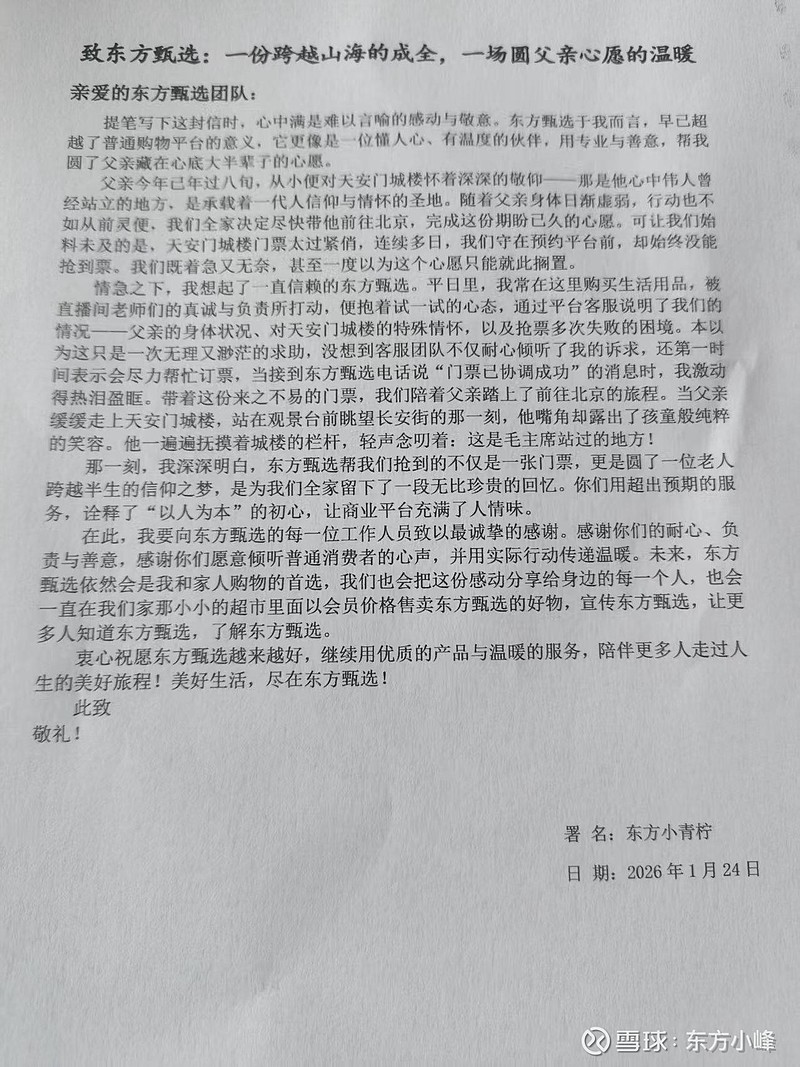 提笔写下这封信时,心中满是难以言喻的感动与敬意。东方甄选于我而言,早已超越了普通购物平台的意义,它更像是一位懂人心、有温度的伙伴,用专业与善意,帮我圆了父亲藏在心底大半辈子的心愿。