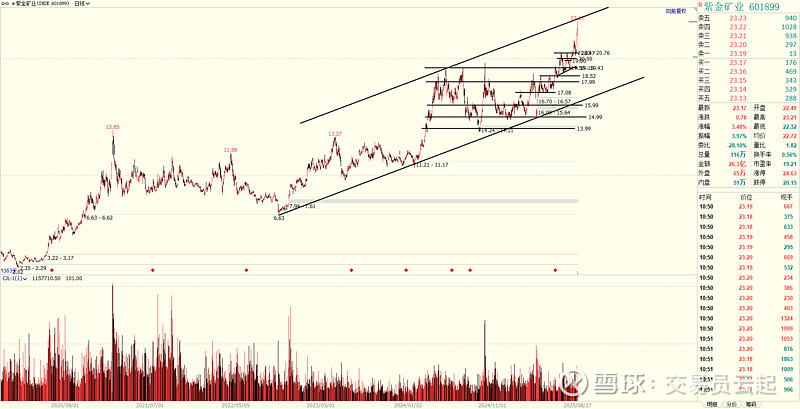$紫金矿业(SH601899)$ 注意大级别通道上轨23.5区域的压力,股价遇阻回落的概率较大,宜减仓,随后调整关注今日低点22.3附近,未来2周能维持在22.3-23.5之间震荡,则会构成上涨中继,即可博它进一步上涨到25附近;