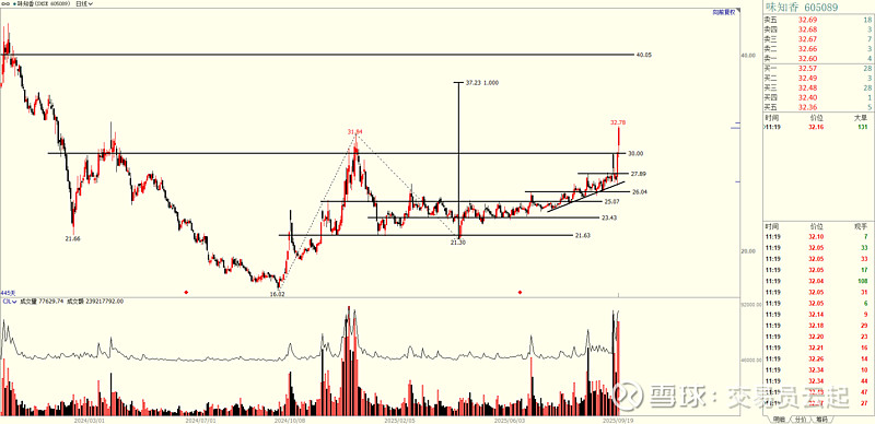 $味知香(SH605089)$ 23.4-25之间头肩底,对应主升浪目标37;