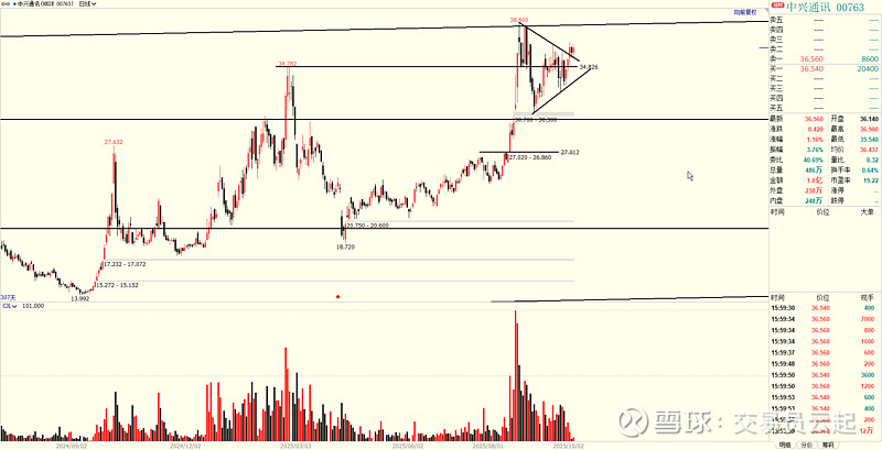 $中兴通讯(00763)$ 围绕35震荡,构成三角形,为上涨中继,新一波主升浪有望到45-50区域;