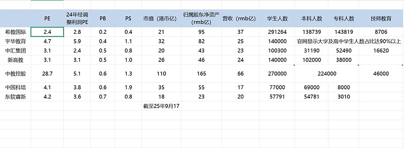 最新教育股估值表。希教国际行业规模第二,PE,PB,PS都是最低