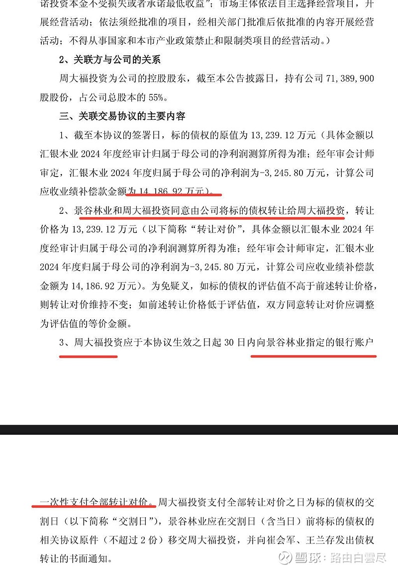 $景谷林业(SH600265)$ 由于业绩承诺未达成,崔王二人需要给公司业绩补偿款1.3亿,大股东怕这债权不好追偿,主动把债权转到自己名下,然后一次性付给上市公司1.3亿,后面追债的事情大股东去做,上市公司不承担任何损失,什么叫良心大股东?这就是了!!!