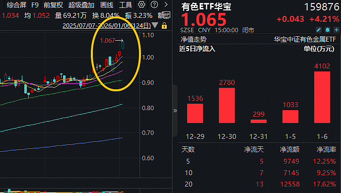 昨日(1月6日)有色金属板块领涨两市,紫金矿业盘中总市值首次站上1万亿元大关,洛阳钼业创历史新高,中国铝业再创15年新高,有色金属板块热门ETF——有色ETF华宝(159876)场内价格猛拉4.21%续创历史新高!