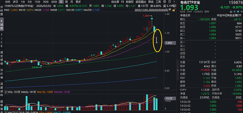 今日(2月2日)A股三大指数悉数跌超2%,此前迭创上市新高的高人气ETF——有色ETF华宝(159876)随市盘整回调,场内跌幅一度缩窄至4.94%,最终收盘跌停,日k线收出倒T型十字星,显示多空分歧加剧。