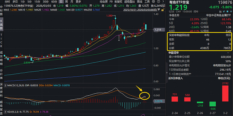 今日(3月3日)A股主要指数悉数收跌,或受市场盘整拖累,此前连续上涨的有色ETF(159876)场内价格重挫5.8%,资金逆行加仓,该ETF全天获资金净申购3600万份,昨天亦单日吸金2192万元。