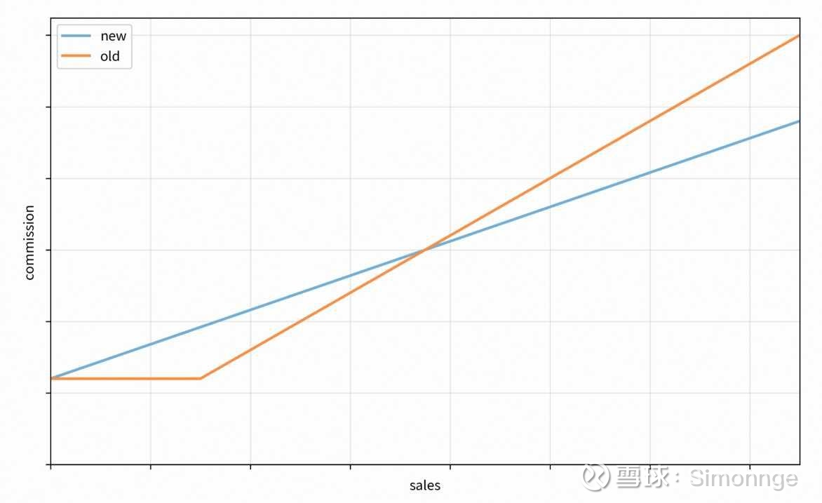 在一定范围内,新方案实际提成高于老方案,在销售额高到一定程度的时候,也就是图中间蓝线和黄线的交点,新方案提成会逐渐不如老方案。斜率为综合扣点