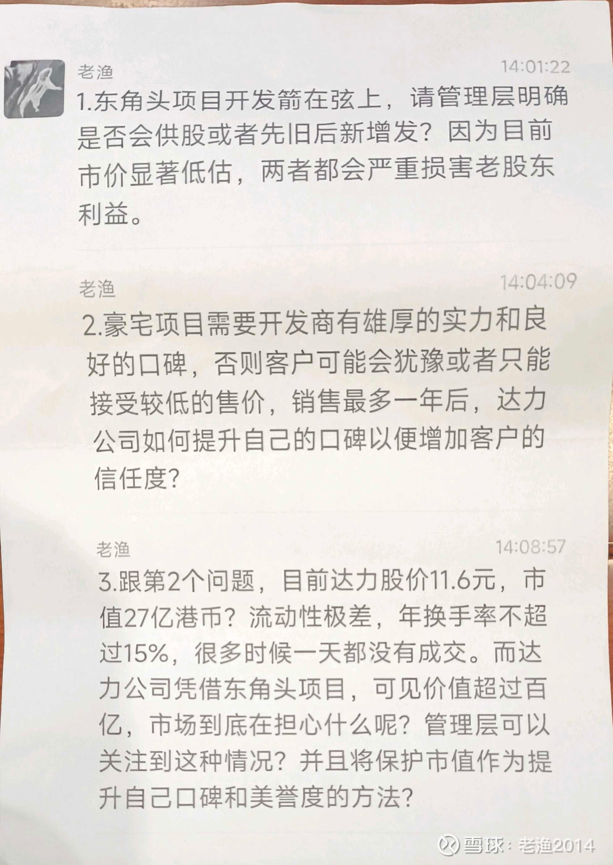 第3个问题,赵总说,有关注到$达力集团(00029)$ 股价,今年曾经到过14元多。我们公司是房地产公司里面表现最好的。——确实如此,也许我们要求太高了。而老派的公司其实是比较冷酷的,这种香港公司太多了。很多正派的公司,其实最后还是爱惜羽毛,但是过程中不会刻意管理股价,做多了违法,做少了没用。