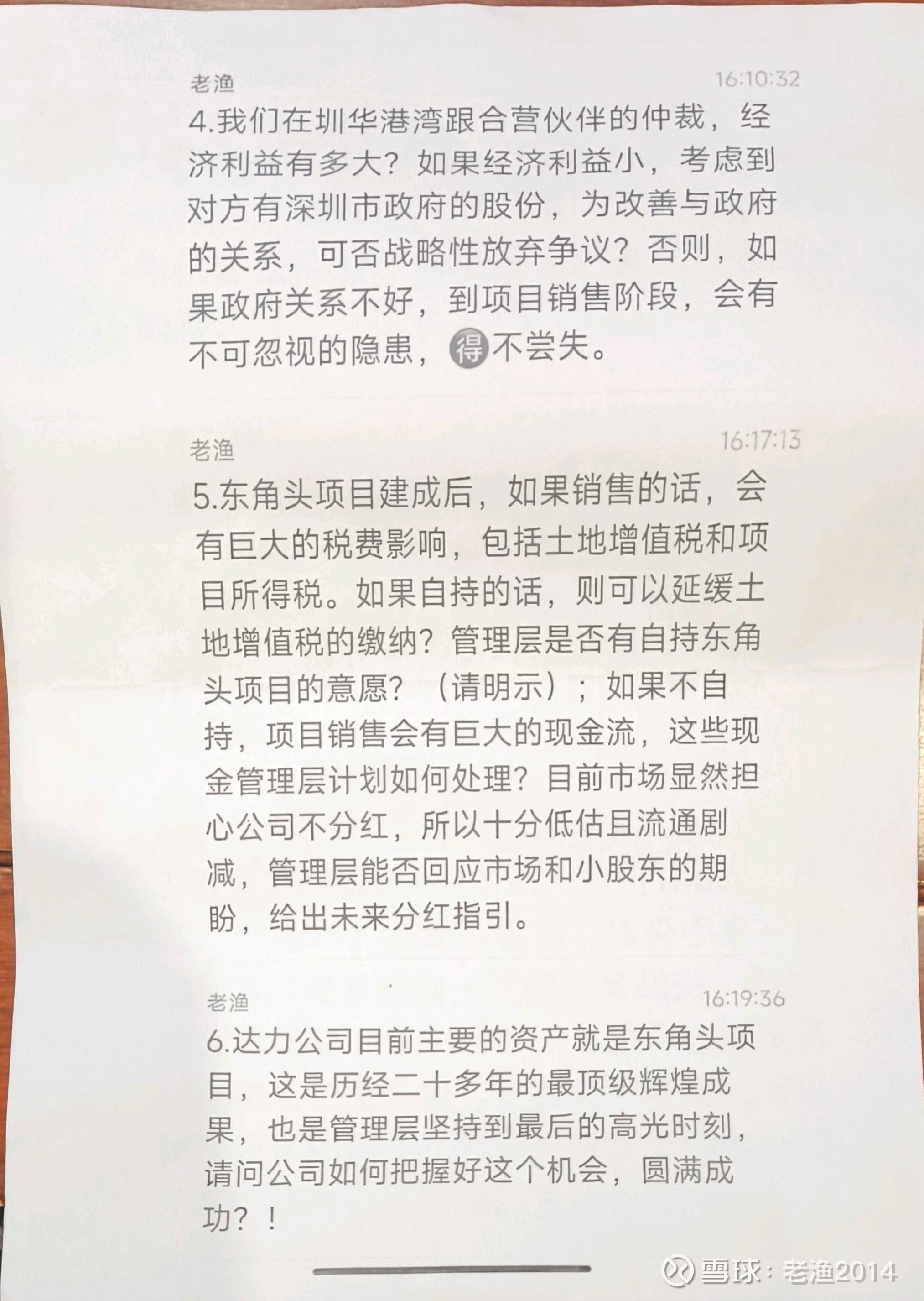 所以,这一次,我作为老股东,选择主动出击,书面提了六个问题,让管理层在股东会上正式回答,考虑不要太唐突,我还是会前把问题给赵少鸿行政总裁和公司秘书,财务总监黄爱仪看了,他们很高兴,立马就同意了(所以,其实他们想向市场传达正面信息,但是鉴于老登做派,不会主动,也不懂怎么做。)