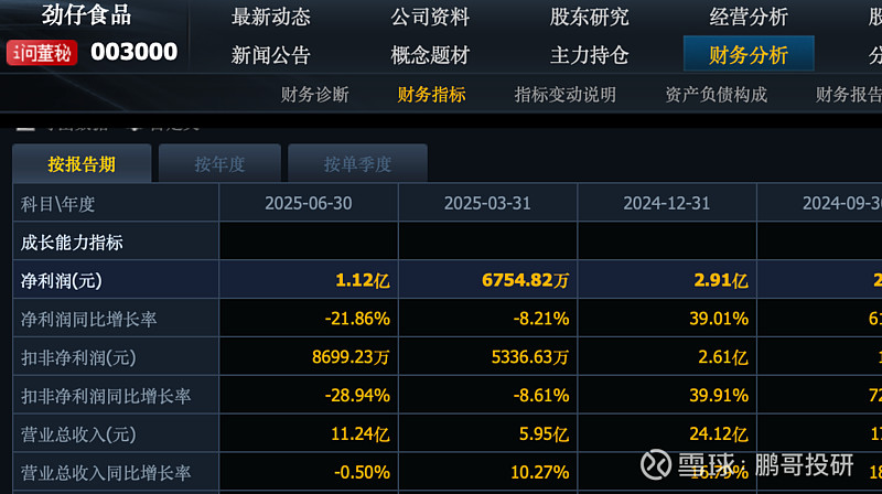 劲仔食品,收入下降1%到11亿,净利润下降22%到1.1亿。