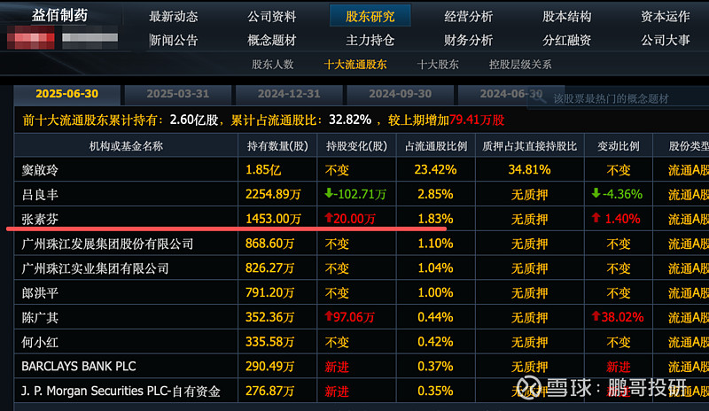 重药控股,张素芬重仓823万股;