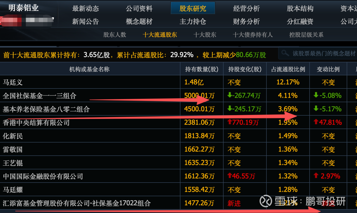 1. 明泰铝业,3家社保持1.1亿股,占比9.01%,市值13.63亿。