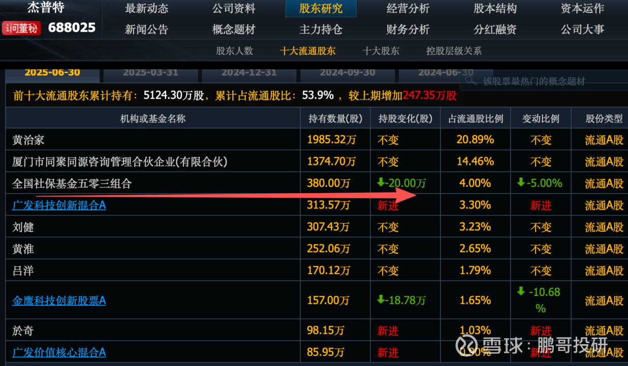 3. 杰普特, 1家社保持380万股,占比4%,市值2.72亿。