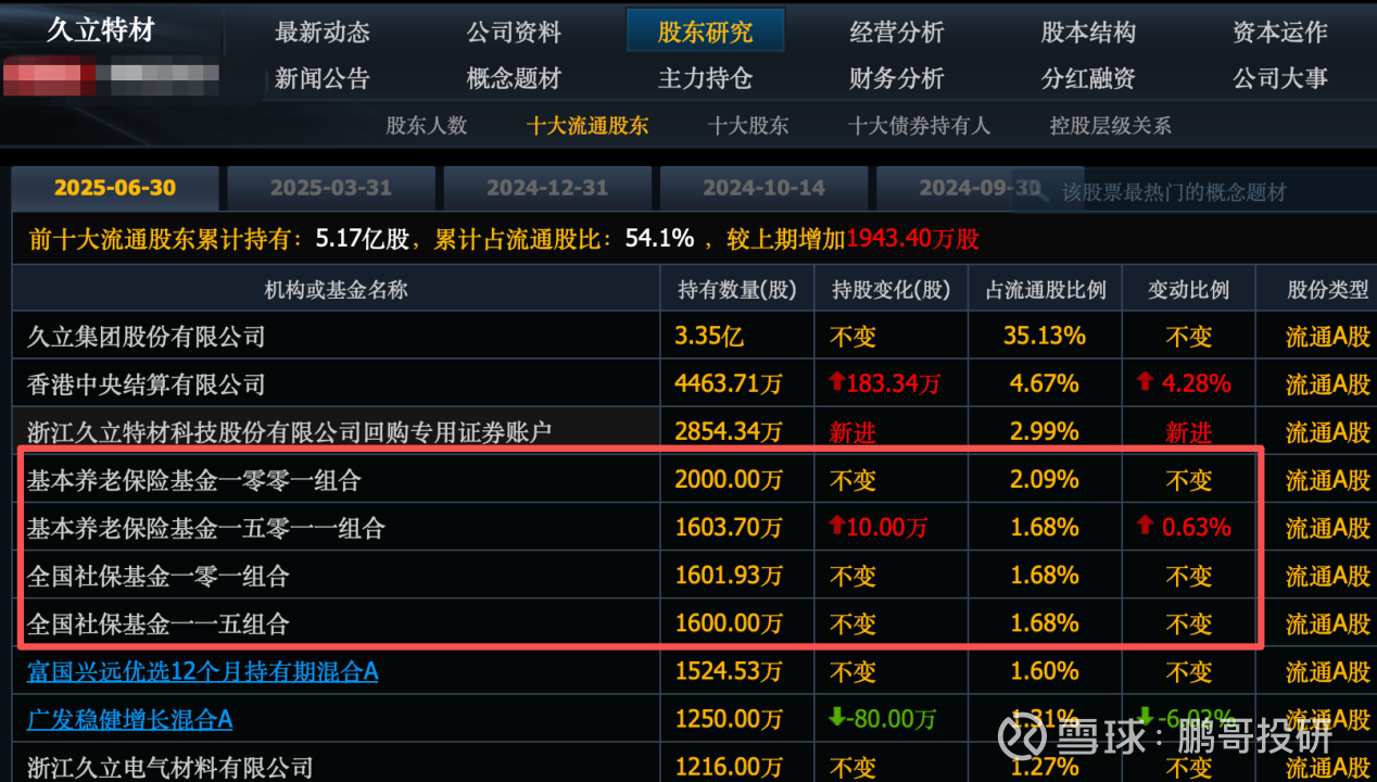 1. 久立特材,4家社保重仓6806万股,社保持股7.13%。