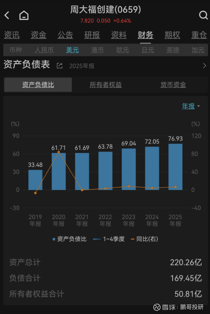 大家先看一组数据:周大福创建(0659.HK)的资产负债率,从2019年的33.48%一路飙升,到2025年已经达到76.93%,负债合计高达169.45亿美元,而股东权益只剩下50亿出头。在这种资金面持续承压的大背景下,市场普遍担心它未来的融资能力。然而,就是在这种情况下,依然有定向投资者愿意溢价认购首程控股的可交换债(EB),这背后释放的信号,就不止是融资动作那么简单了。