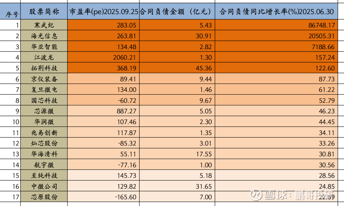 整个半导体板块,2025年中报合同负债金额大于1亿,而且还能有10%以上增长的公司,只有17个。其中寒武纪中报的合同负债增长了867倍,说明未来寒武纪业绩增长的确定性非常高,所以股价一直涨。海光信息也非常夸张增长了205倍,华亚智能,江波龙,拓荆科技也都是翻倍的增长。