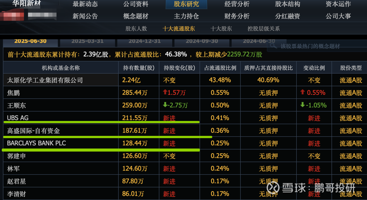 比如华阳新材,今年第二季度,瑞银新进了212万股,高盛新进了188万股,还有巴克莱也是重仓了128万股。都是新进入前十大股东的,不过这个公司今年以来被炒作了几轮也是比较高了,大家要注意风险。