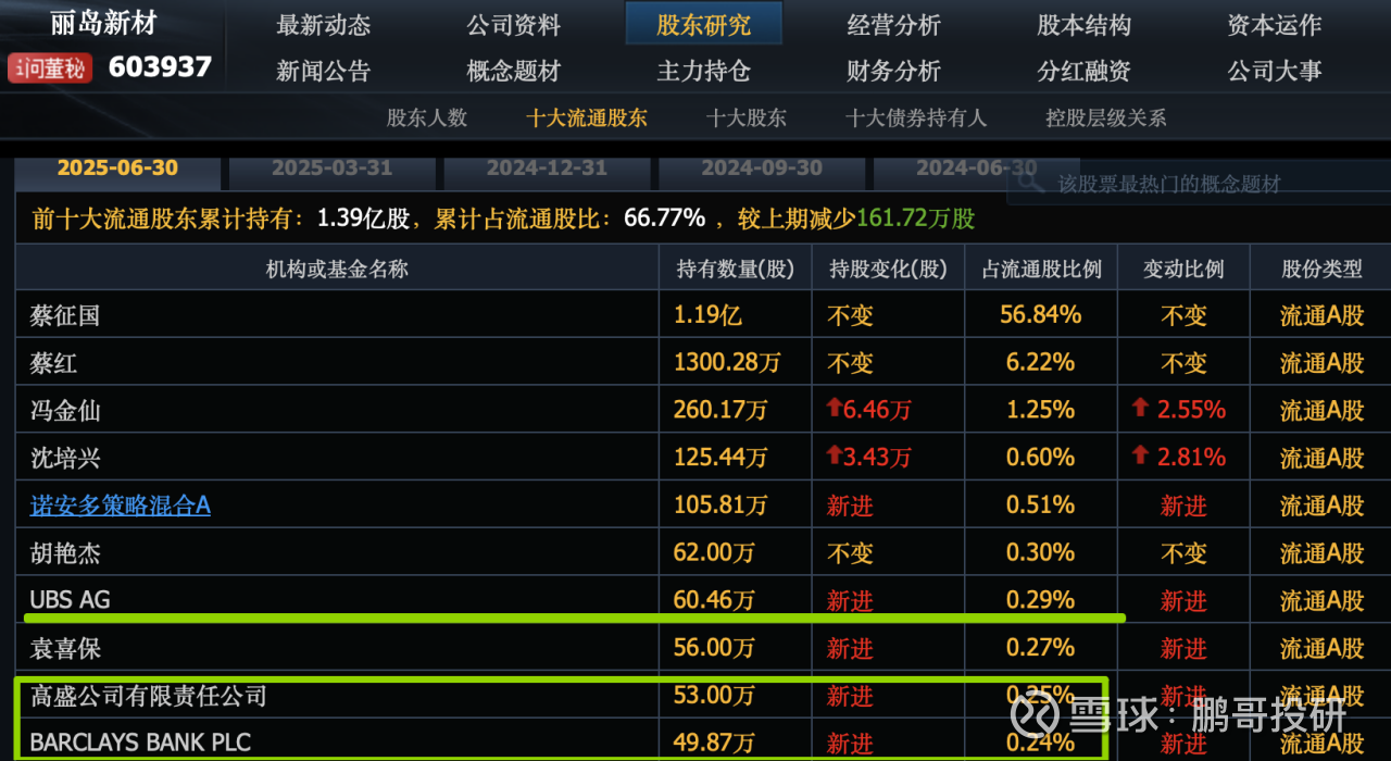 还有丽岛新材也是一样,我们可以通过前十大股东看到,瑞银新进了60万股,高盛新进了53万股,还有巴克莱新进了50万股。这个股票最近持续异动,外资已经有浮盈,大家也要小心接盘。