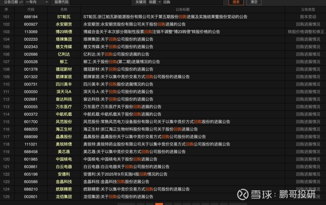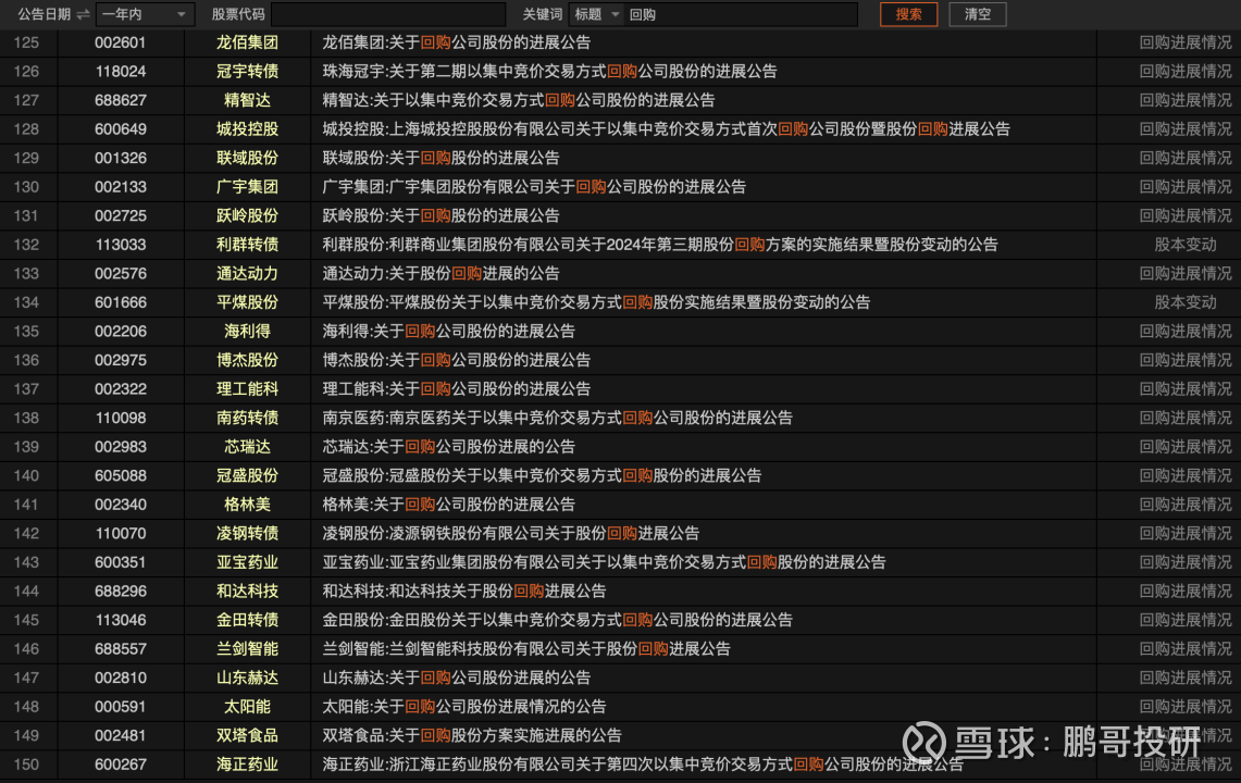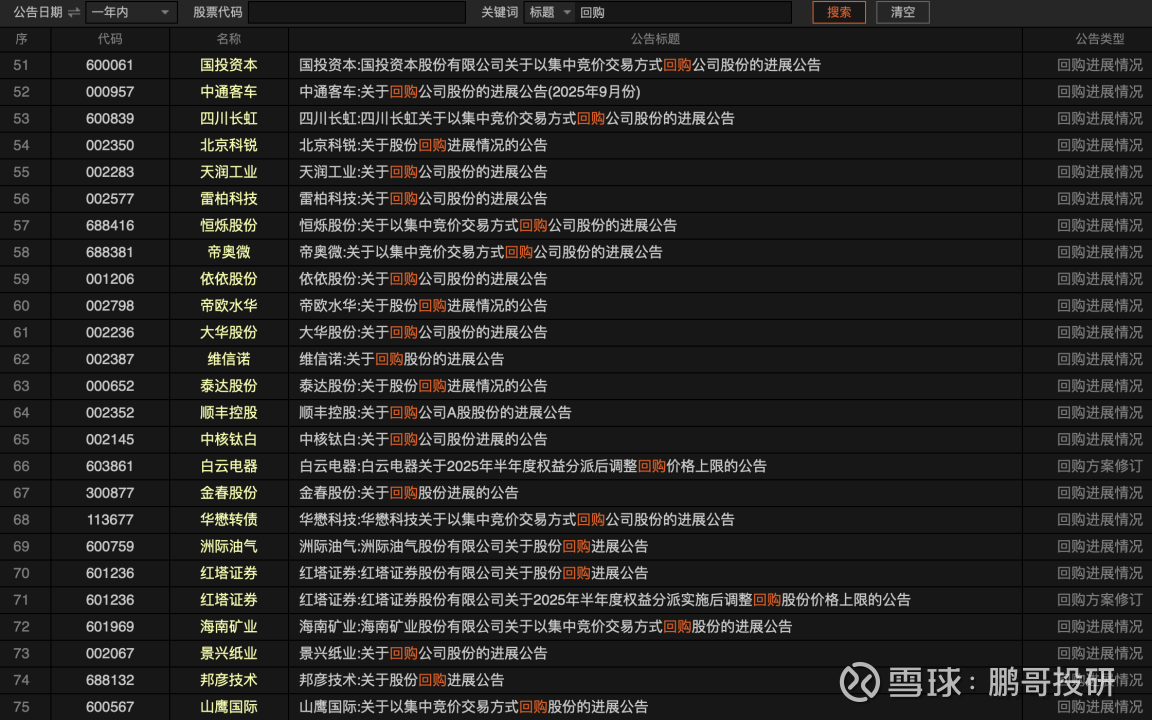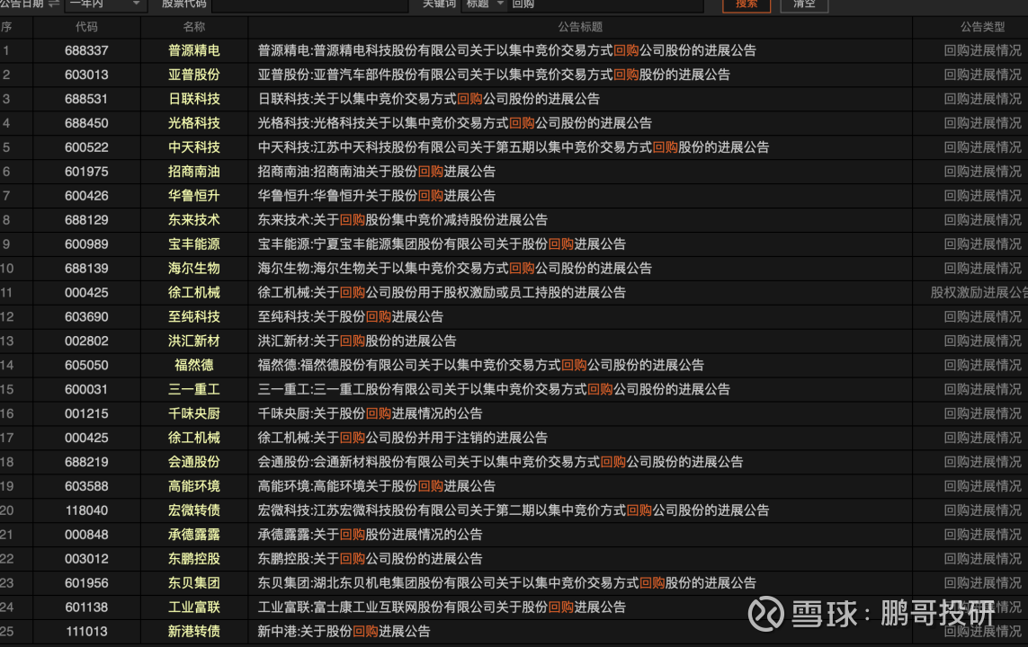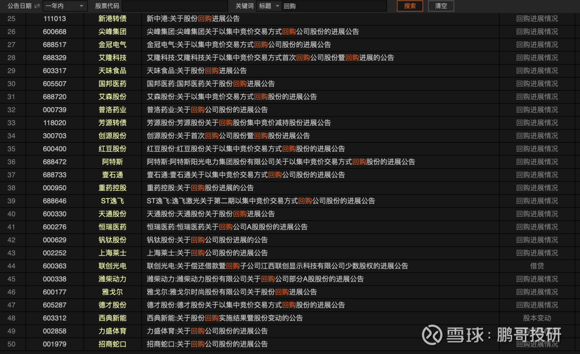 当然这样的公司还有非常多啊,我吧名单都截图出来了,大家可以对照名单看看有没有自己的持仓,然后根据公告看看哪些是回购搞股权激励的,哪些是搞回购注销的,那些做了回购注销的,而且回购金额还比较大的,这样的公司才是真正值得我们重点看看的。