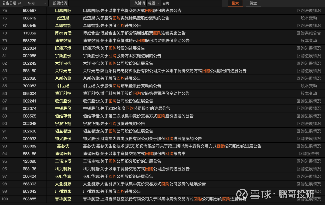 今天晚上好多回购公告啊,刚刚我看了下,吓我一条,一晚上发布了261份回购公告,这是我从来没有见过的场面。去年股价跌那么惨,没有看到有这么多公司发布回购公告,现在指数涨起来了,很多股票没有涨,这些公司也比较着急,想蹭题材蹭不上,都开始发布回购公告,想吸引投资者了,我们一起看看到底哪些公司发布回购公告,看看有没有你的持仓。