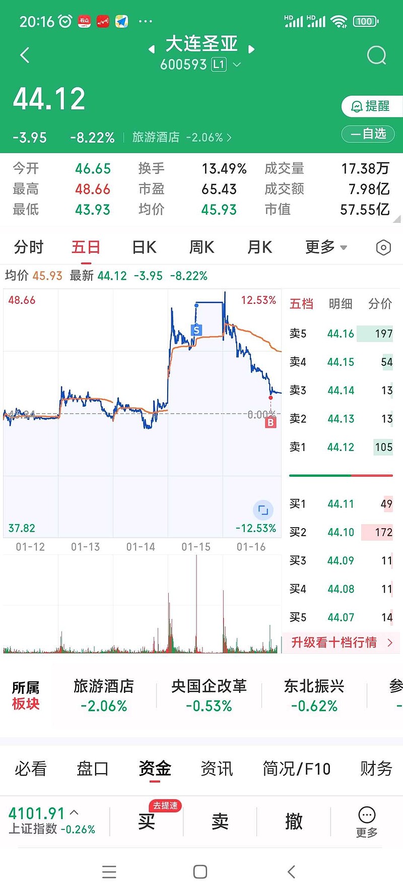 大连圣亚拿了好多天。科技都涨疯了。大连圣亚就是微微涨。年底这段时间比较忙基本上都没时间看手机。所以每天我都挂涨停板卖出。15号涨停卖出,16号尾盘我看跌这么多又买进去了。我感觉有点进早了,星期一肯定还会低开。#大连圣亚