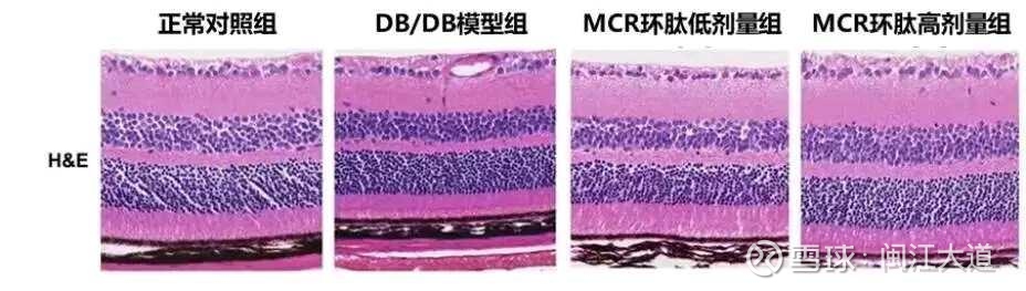 实验结果显示,DB/DB模型小鼠的内核层(INL)和外核层(ONL)厚度明显变薄,这是糖尿病引起视网膜变性的典型特征。而经过MCR环肽治疗后,视网膜结构得到明显改善: