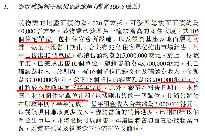 香港鴨脷洲平瀾街8號弦岸,共105个单位,2026H1及之前售出已确认收入的合共26个,按公司预计2026H2售出的16个单位价值来算,余下79个单位货值88,200,000/16x79=435,487,500,保守打个7折也值3亿港元(未算商铺)。