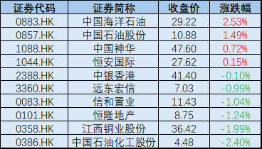 标普港股通低波红利指数前十大成分股今日表现